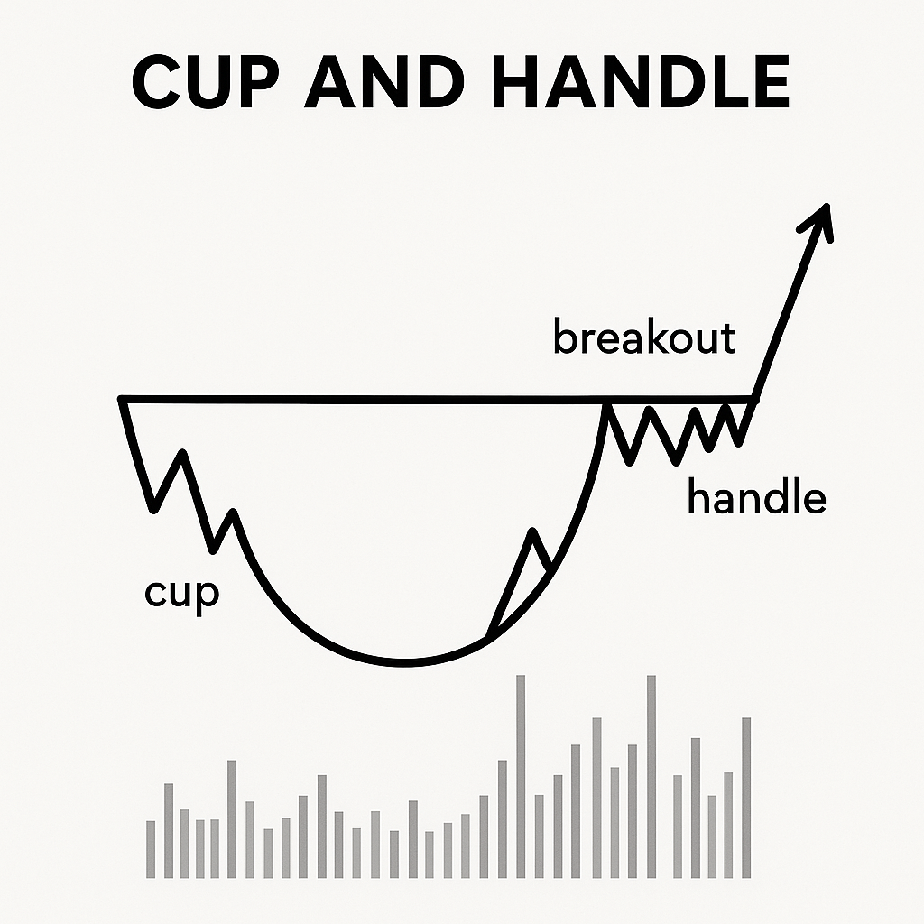 The Handle: After the cup is formed, a slight pullback or sideways movement creates the handle. This part typically slopes downward or moves sideways and lasts a shorter period than the cup. The handle reflects a short term consolidation or shakeout before the next move.